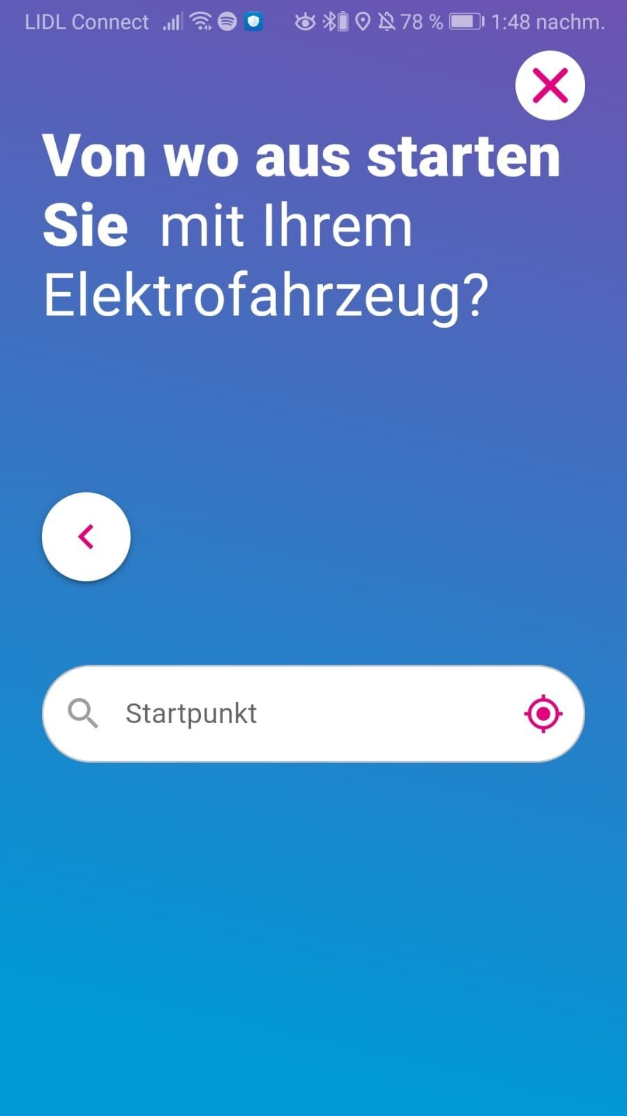 Anschließend bestätigen Sie den aktuellen Ladezustand Ihres Fahrzeugs. Unter Berücksichtigung des Ladezustands berechnet die App die optimale Reiseroute, welche sich während der Fahrt ständig aktualisiert und die Batteriekapazität des Fahrzeugs einkalkuliert, damit das Fahrzeug bei Bedarf zu einer Ladestation umgeleitet wird. Mit Hilfe dieser Live-Neuberechnung wird ermöglicht, dass die Reiseroute neu berechnet wird, sollte die Lebensdauer der Batterie von der ursprünglich kalkulierten Lebensdauer abweichen.