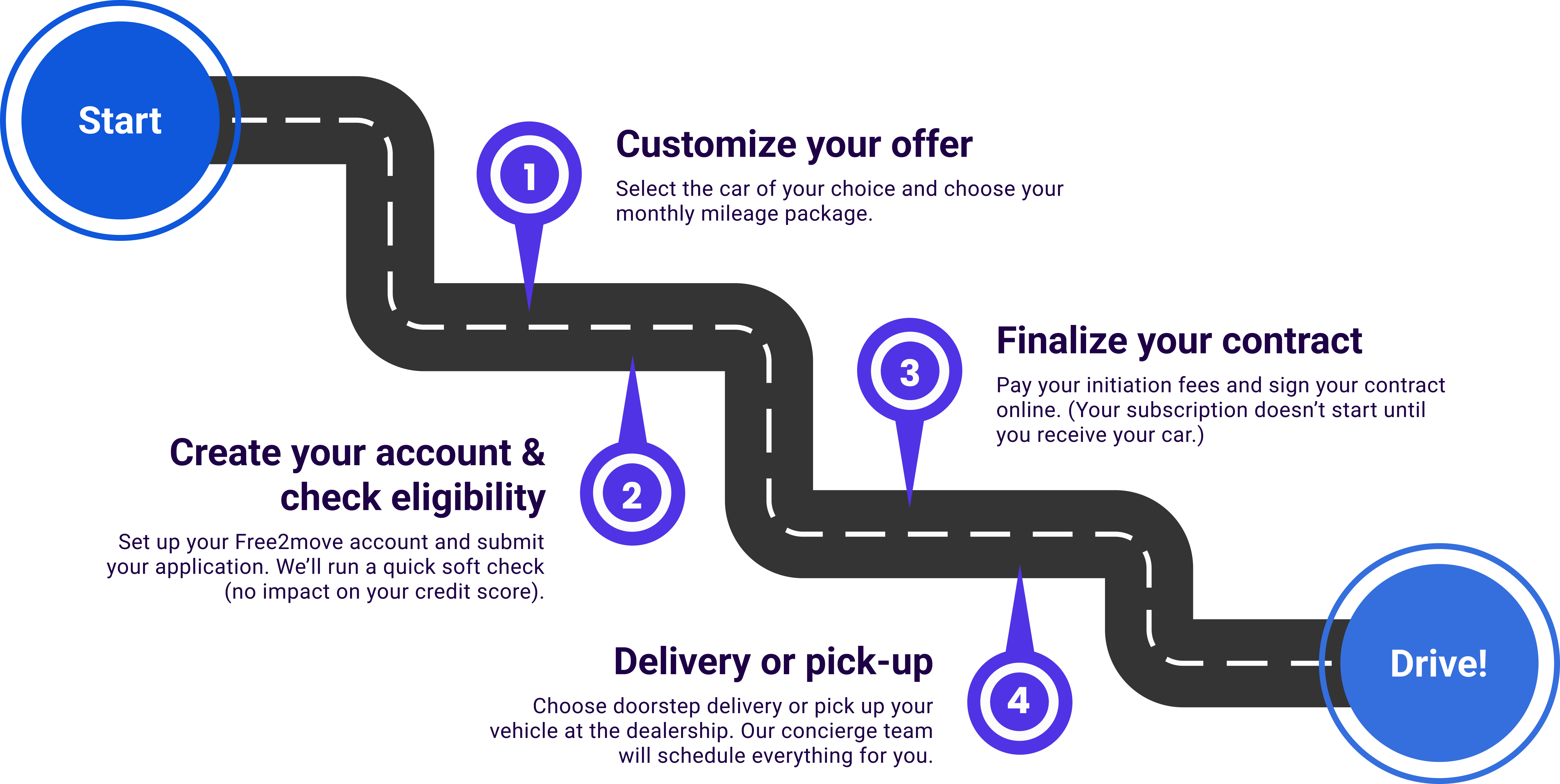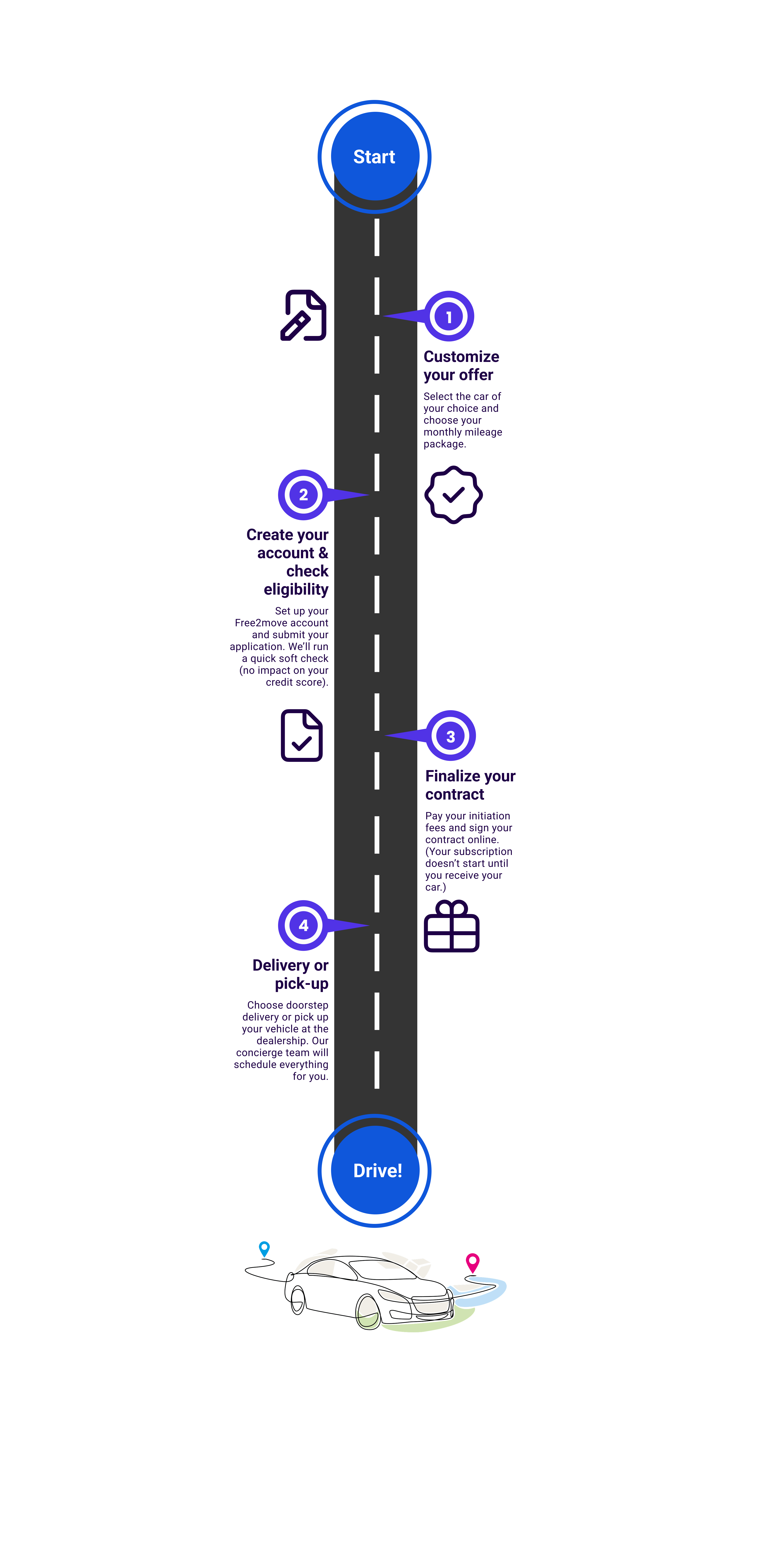 All you have to do is browse our available offers at https://www.free2move.com/en-US/car-on-demand/our-offers, select the car you want, make sure your zip code is within our service area to access the application page.