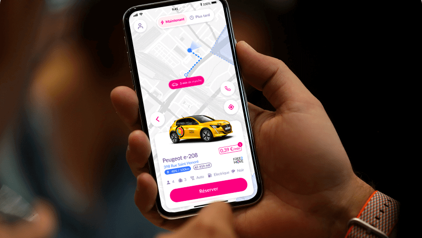 Someone using Free2Move app to book a yellow Peugeot e-208